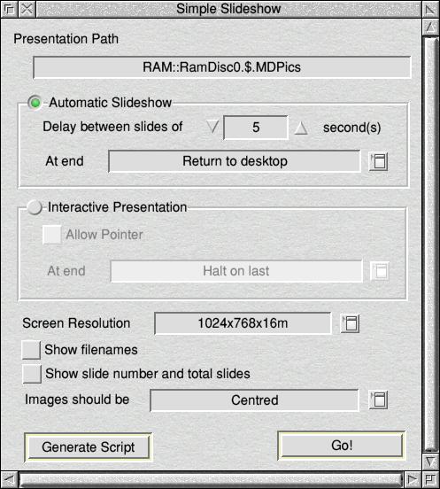 This window has the most common options that people will find useful. I think most of it is self-explanatory. Selecting either "Automatic Slideshow" or "Interactive Presentation" will make obvious sections enabled or disabled.