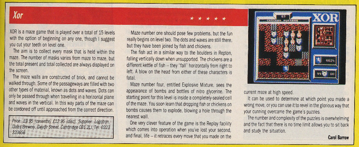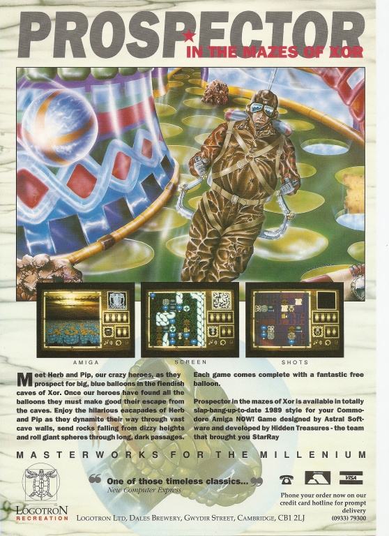 Full page advertisment for "Prospector in the mazes of XOR" on the Amiga.